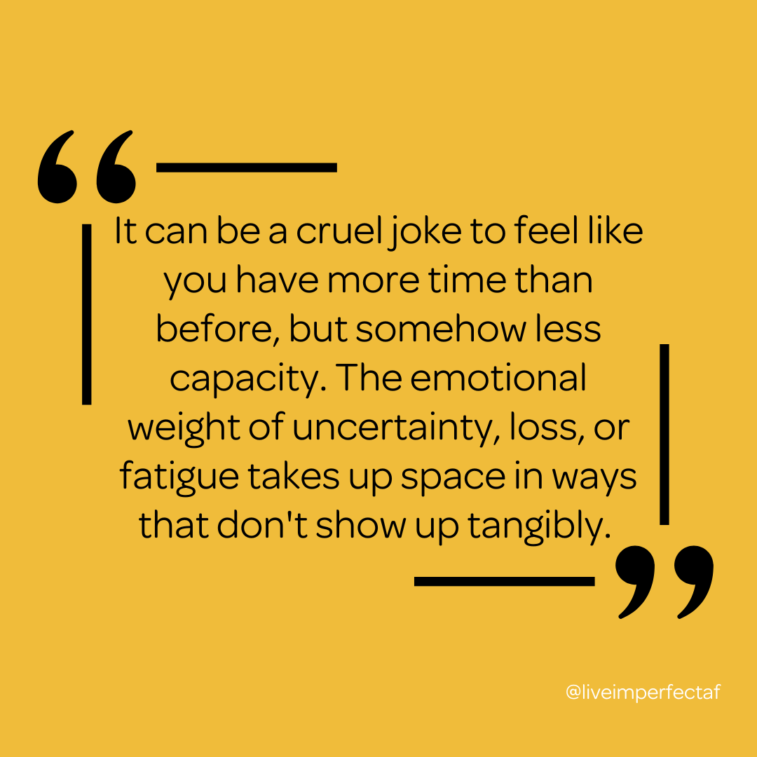 Some of these vampires are sneaky. Things like job uncertainty, grief, and burnout don't block appointments on your calendar. It can be a cruel joke to feel like you have more time than before, but somehow less capacity. The emotional weight of uncertainty, loss, or fatigue takes up space in ways that don't show up tangibly. An empty calendar doesn't mean you have energy to fill it.